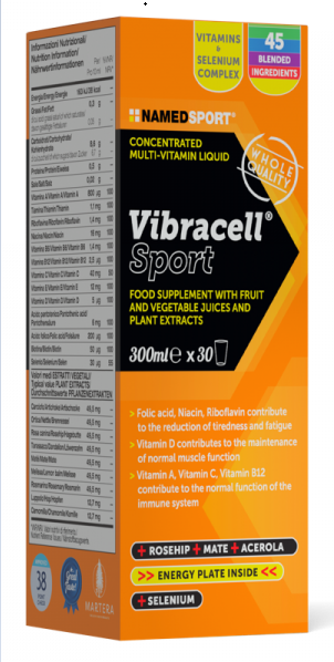 Con vitamine A, C, E e vitamine del gruppo B, Vibracell® Sport è arricchito con Selenio e un complesso mix di carboidrati a diversa velocità di assimilazione.
