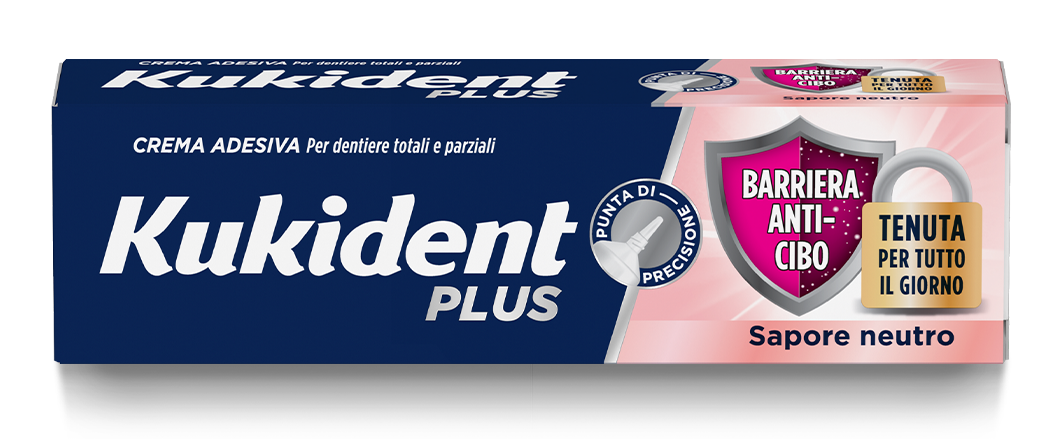 Kukident Plus Barriera Anti-Cibo Sapore Fresco non solo ti aiuta a mantenere la protesi al suo posto, ma contribuisce anche a creare una comoda barriera per evitare che il cibo si infiltri sotto la protesi.