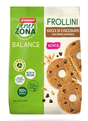 Frollini con gocce di cioccolato, a basso impatto glicemico. Ricchi in proteine e fonte di fibre, sono bilanciati nei macronutrienti e 100% vegetali, adatti anche a un'alimentazione vegana.