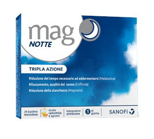 1 bustina monodose al giorno da prendere la sera prima di coricarsi. Mag Notte può essere posto direttamente sulla lingua senz’acqua, oppure può essere sciolto in una tazza di acqua calda o fredda e zuccherato a piacere. In caso di jet-lag si consiglia di iniziare ad assumere una bustina di Mag Notte prima di andare a dormire il primo giorno di viaggio e di continuare l’assunzione per alcuni giorni dopo l’arrivo.
