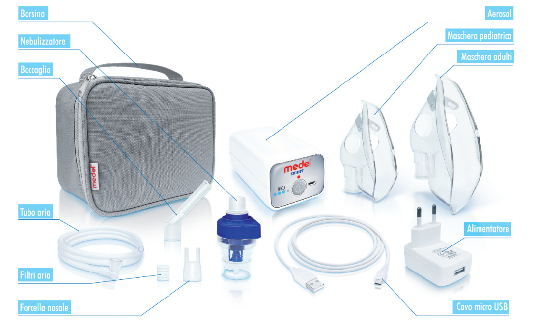 Nebulizzatore MedelJet Smart; maschera adulti; Maschera pediatrica; Boccaglio; Forcella nasale; 5 filtri aria di ricambio; Tubo aria; Borsina per il trasporto e la conservazione; cavo USB; adattatore.