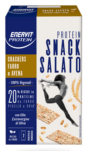 Crackers proteici al Farro e Avena, con il 20% di proteine. 100% vegetali, ricchi in fibre e preparati con Olio Extravergine di Oliva.