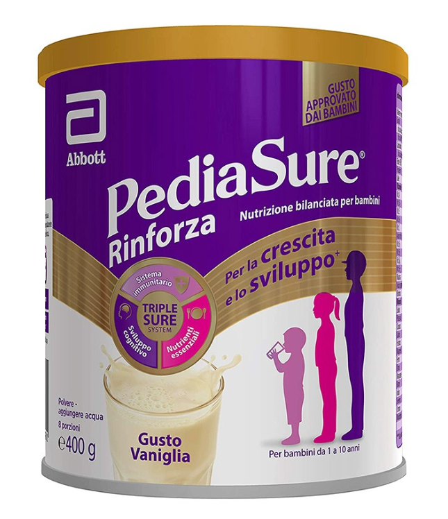 Pediasure Rinforza Vaniglia è un prodotto nutrizionale in forma di polvere che può essere usato come sostituto del pasto o come integrazione della normale alimentazione nei bambini da 1 a 10 anni. La sua formulazione apporta tutti i nutrienti di cui l'organismo ha bisogno ed è privo di glutine adattandosi anche a particolari regimi alimentari controllati.